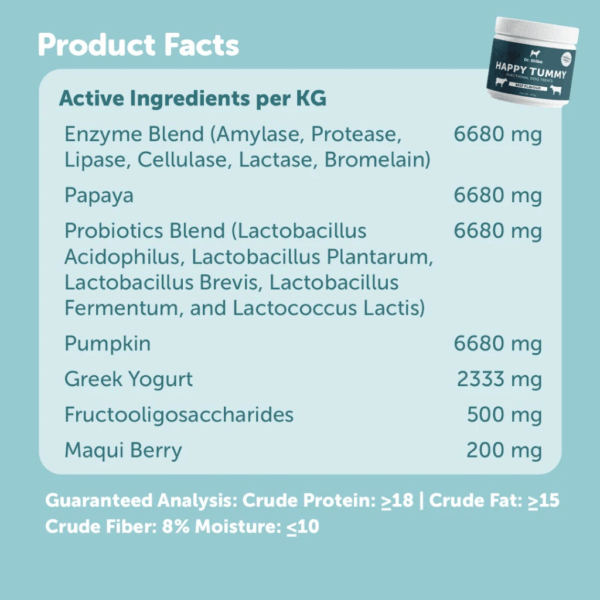 Happy Tummy is your dogās ultimate source of delight and nutrition for their tummy! Give your furry family member a healthier and happier life with this protein-rich combination of pre-and probiotics.