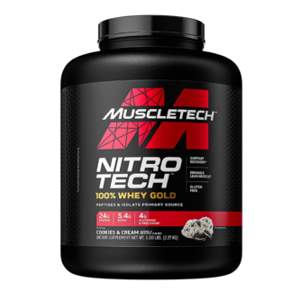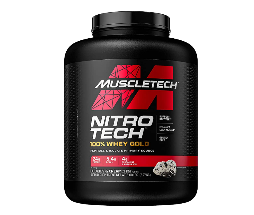 NITRO-TECH 100% WHEY GOLD is a superior 100% whey protein powder designed for men and women looking to improve recovery, build lean muscle, improve strength and enhance performance. NITRO-TECH 100% WHEY GOLD from MuscleTech contains pure whey protein isolate and peptides as the primary protein source. Every scoop provides 24 grams of ultra-pure whey protein, 5.5 grams of Branched Chain Amino Acids (BCAAs) and 4g of glutamine and peptides. What’s more, it’s great-tasting flavors don’t pack the extra sugar and carbs you’ll see in other whey protein powders. Plus, for a limited time, you 10% more protein for free! Try the bonus size today!