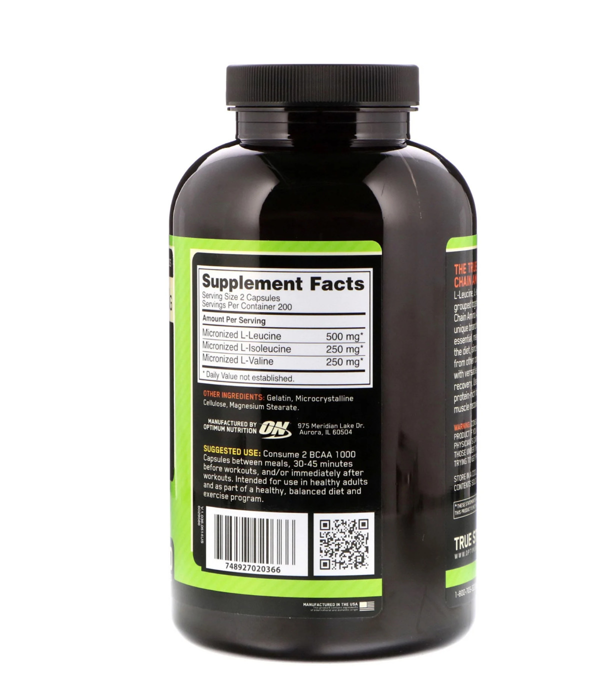 Optimum Nutrition’s BCAA 1000 capsules contain a powerful balance of Branched Chain Amino Acids which are the building blocks of muscle mass and size. Metabolized directly in the muscle, BCAAs may improve nitrogen retention by sparing other amino acid groups for repair and rebuilding. The Branched Chain Amino Acids (BCAA’s), so named because of their unique branched chemical structure, are necessary in that the body cannot make them from other compounds. In recent times, these amino acids have been researched for their possible anticatabolic (preventing muscle breakdown) and anabolic (muscle building) effects.