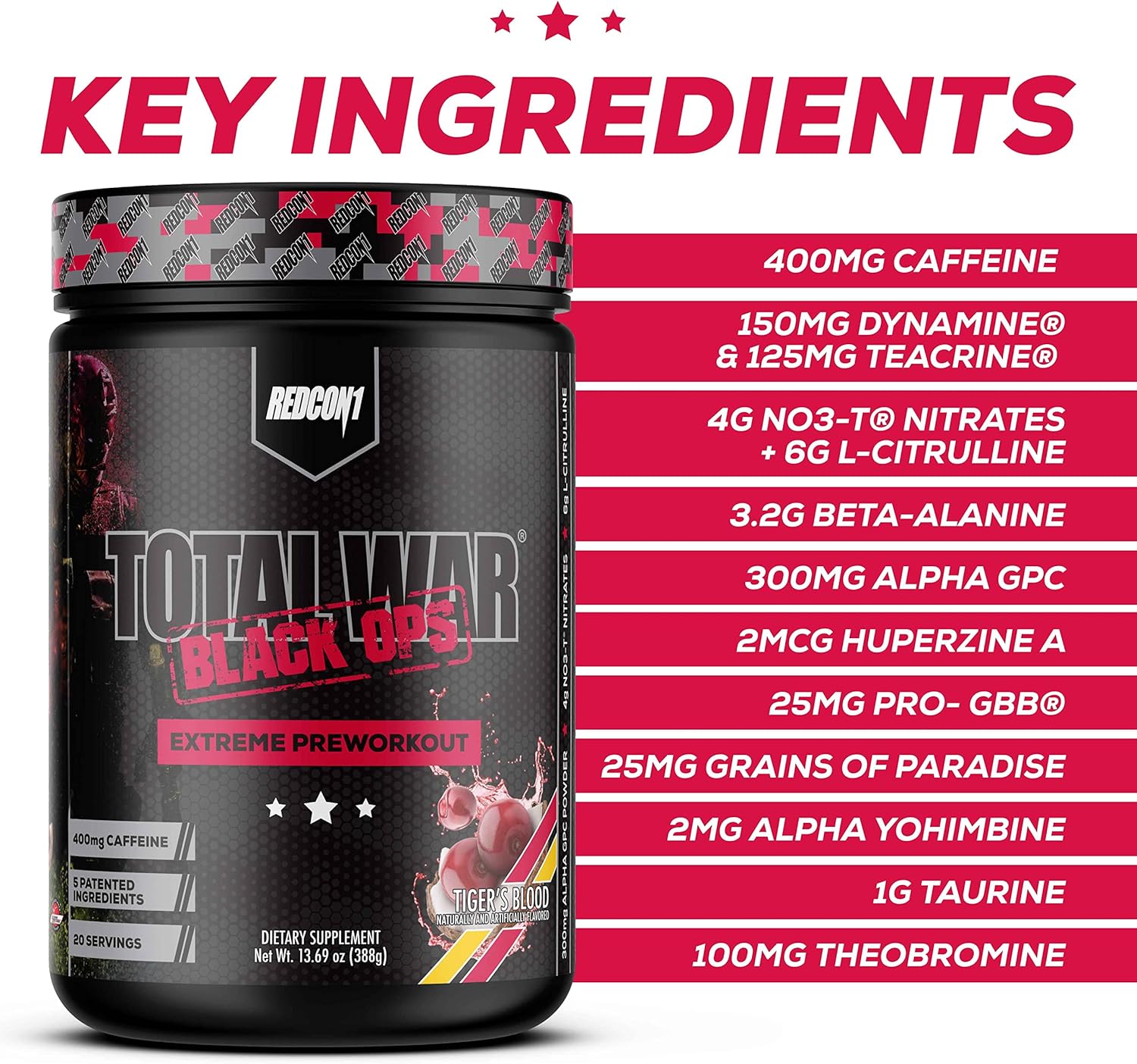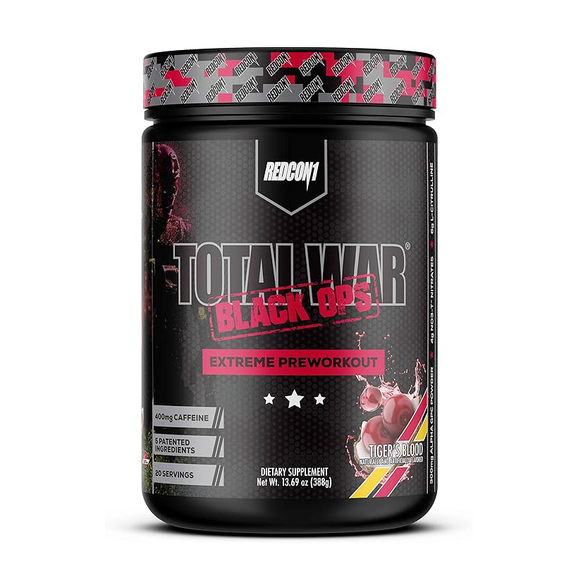 TOTAL WAR is an award winning, complete, all-in-one preworkout. It is expertly formulated to enhance energy, endurance, strength and pumps. It provides unstoppable power to help you dominate your most challenging workouts. It’s the OG complete preworkout and it delivers an incredible workout experience every single time. Formulated over 6 years ago, the formula hasn’t changed, and it remains a top selling preworkout in the market. TOTAL WAR BLACK OPS takes TOTAL WAR to the extreme. It dials up many of TOTAL WAR’S original ingredients to give maximum energy, pumps and mind-muscle connection. It also includes a thermogenic complex to dial in your physique. TOTAL WAR BLACK OPS isn’t for the faint of heart. Its extreme intensity is felt almost instantly and is sustained for the duration of your workout. There is nothing on the market like TOTAL WAR BLACK OPS. * Assess tolerance with 1/2 scoop before use. Do not combine with other sources of caffeine. Do not exceed 1 scoop per day.